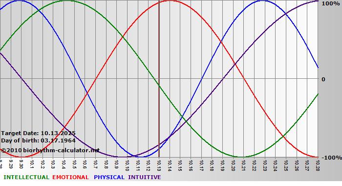 Your biorhythm above the horizontal line indicates that your capacity in that area is enhanced; you feel stronger, more alert, more connected, more empathetic. These are times when you are able to do more, be more, enjoy more. When the biorhythm lines are below 0%, your capacity is diminished, and conservative behavior is recommended.