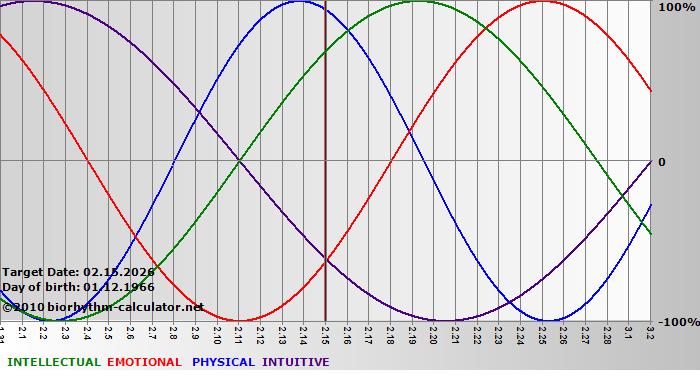 Your biorhythm above the horizontal line indicates that your capacity in that area is enhanced; you feel stronger, more alert, more connected, more empathetic. These are times when you are able to do more, be more, enjoy more. When the biorhythm lines are below 0%, your capacity is diminished, and conservative behavior is recommended.