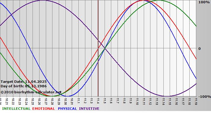 Your biorhythm above the horizontal line indicates that your capacity in that area is enhanced; you feel stronger, more alert, more connected, more empathetic. These are times when you are able to do more, be more, enjoy more. When the biorhythm lines are below 0%, your capacity is diminished, and conservative behavior is recommended.