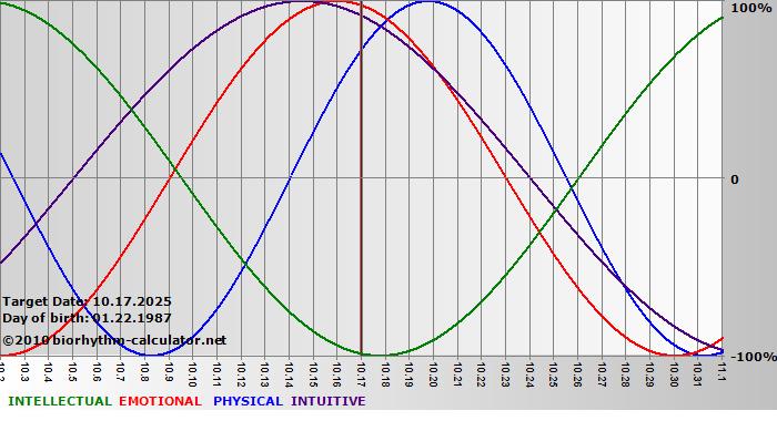 Your biorhythm above the horizontal line indicates that your capacity in that area is enhanced; you feel stronger, more alert, more connected, more empathetic. These are times when you are able to do more, be more, enjoy more. When the biorhythm lines are below 0%, your capacity is diminished, and conservative behavior is recommended.