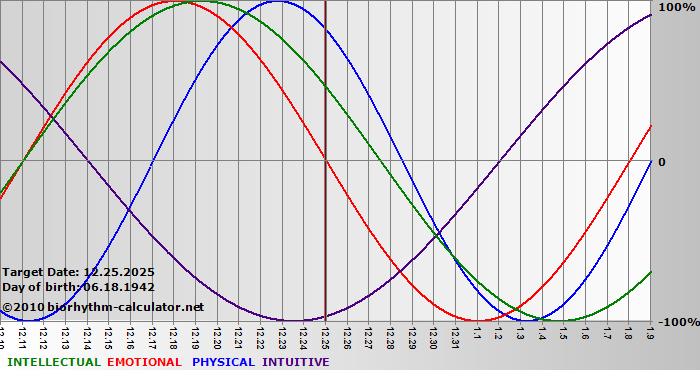 Your biorhythm above the horizontal line indicates that your capacity in that area is enhanced; you feel stronger, more alert, more connected, more empathetic. These are times when you are able to do more, be more, enjoy more. When the biorhythm lines are below 0%, your capacity is diminished, and conservative behavior is recommended.