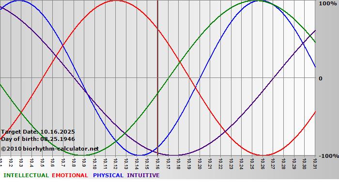 Your biorhythm above the horizontal line indicates that your capacity in that area is enhanced; you feel stronger, more alert, more connected, more empathetic. These are times when you are able to do more, be more, enjoy more. When the biorhythm lines are below 0%, your capacity is diminished, and conservative behavior is recommended.