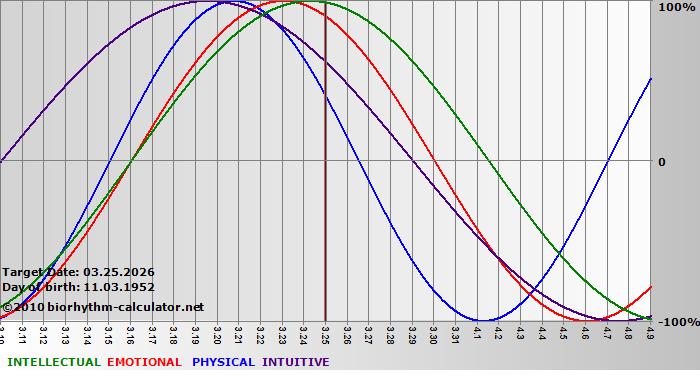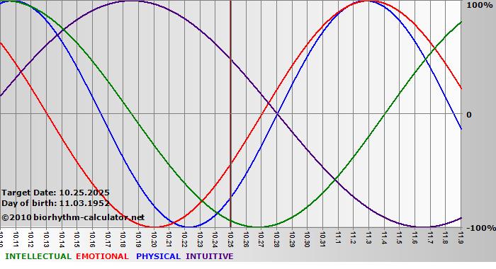 Your biorhythm above the horizontal line indicates that your capacity in that area is enhanced; you feel stronger, more alert, more connected, more empathetic. These are times when you are able to do more, be more, enjoy more. When the biorhythm lines are below 0%, your capacity is diminished, and conservative behavior is recommended.