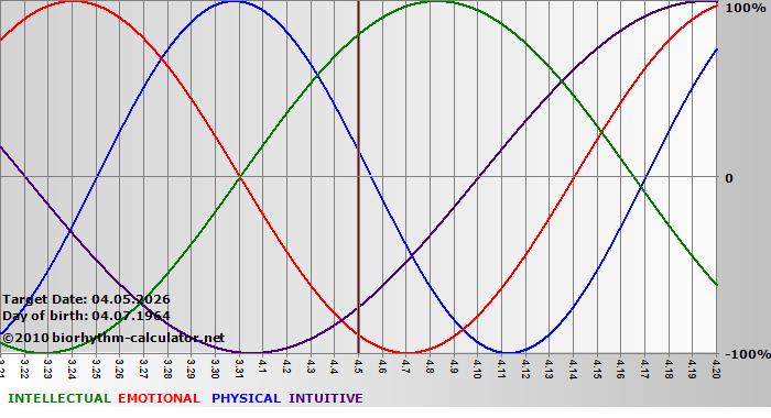 Your biorhythm above the horizontal line indicates that your capacity in that area is enhanced; you feel stronger, more alert, more connected, more empathetic. These are times when you are able to do more, be more, enjoy more. When the biorhythm lines are below 0%, your capacity is diminished, and conservative behavior is recommended.