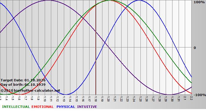 Your biorhythm above the horizontal line indicates that your capacity in that area is enhanced; you feel stronger, more alert, more connected, more empathetic. These are times when you are able to do more, be more, enjoy more. When the biorhythm lines are below 0%, your capacity is diminished, and conservative behavior is recommended.