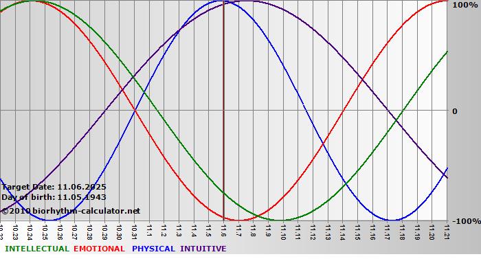 Your biorhythm above the horizontal line indicates that your capacity in that area is enhanced; you feel stronger, more alert, more connected, more empathetic. These are times when you are able to do more, be more, enjoy more. When the biorhythm lines are below 0%, your capacity is diminished, and conservative behavior is recommended.