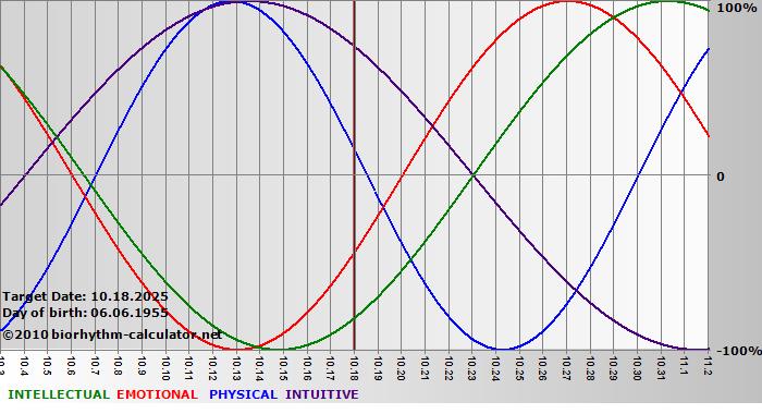 Your biorhythm above the horizontal line indicates that your capacity in that area is enhanced; you feel stronger, more alert, more connected, more empathetic. These are times when you are able to do more, be more, enjoy more. When the biorhythm lines are below 0%, your capacity is diminished, and conservative behavior is recommended.