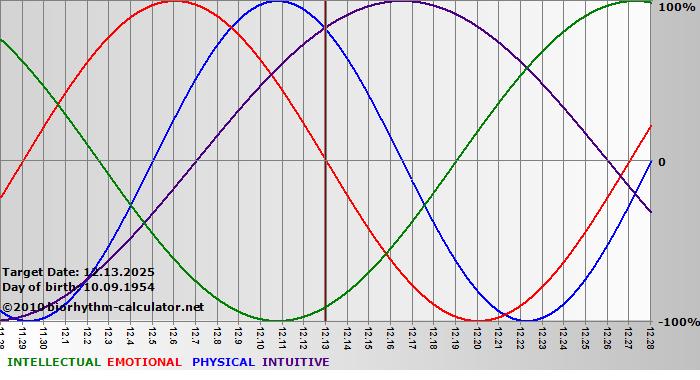 Your biorhythm above the horizontal line indicates that your capacity in that area is enhanced; you feel stronger, more alert, more connected, more empathetic. These are times when you are able to do more, be more, enjoy more. When the biorhythm lines are below 0%, your capacity is diminished, and conservative behavior is recommended.