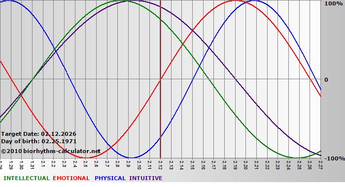 Your biorhythm above the horizontal line indicates that your capacity in that area is enhanced; you feel stronger, more alert, more connected, more empathetic. These are times when you are able to do more, be more, enjoy more. When the biorhythm lines are below 0%, your capacity is diminished, and conservative behavior is recommended.