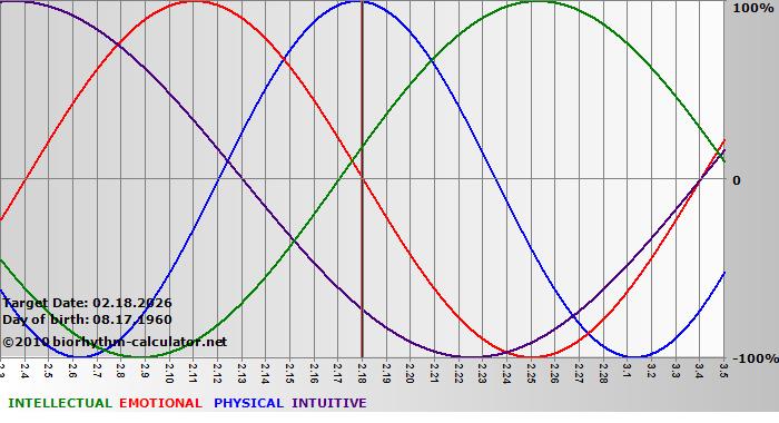 Your biorhythm above the horizontal line indicates that your capacity in that area is enhanced; you feel stronger, more alert, more connected, more empathetic. These are times when you are able to do more, be more, enjoy more. When the biorhythm lines are below 0%, your capacity is diminished, and conservative behavior is recommended.