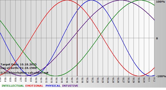 Your biorhythm above the horizontal line indicates that your capacity in that area is enhanced; you feel stronger, more alert, more connected, more empathetic. These are times when you are able to do more, be more, enjoy more. When the biorhythm lines are below 0%, your capacity is diminished, and conservative behavior is recommended.