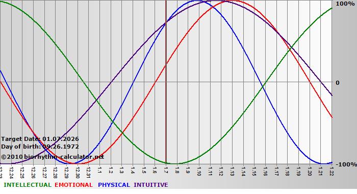 Your biorhythm above the horizontal line indicates that your capacity in that area is enhanced; you feel stronger, more alert, more connected, more empathetic. These are times when you are able to do more, be more, enjoy more. When the biorhythm lines are below 0%, your capacity is diminished, and conservative behavior is recommended.