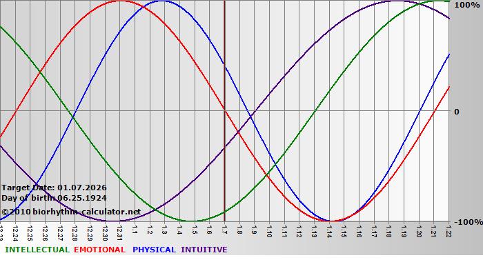 Your biorhythm above the horizontal line indicates that your capacity in that area is enhanced; you feel stronger, more alert, more connected, more empathetic. These are times when you are able to do more, be more, enjoy more. When the biorhythm lines are below 0%, your capacity is diminished, and conservative behavior is recommended.