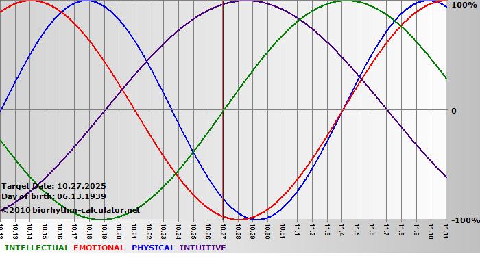 Your biorhythm above the horizontal line indicates that your capacity in that area is enhanced; you feel stronger, more alert, more connected, more empathetic. These are times when you are able to do more, be more, enjoy more. When the biorhythm lines are below 0%, your capacity is diminished, and conservative behavior is recommended.