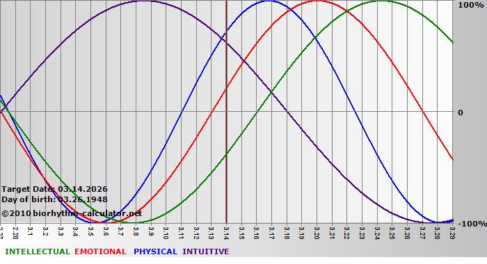 Your biorhythm above the horizontal line indicates that your capacity in that area is enhanced; you feel stronger, more alert, more connected, more empathetic. These are times when you are able to do more, be more, enjoy more. When the biorhythm lines are below 0%, your capacity is diminished, and conservative behavior is recommended.