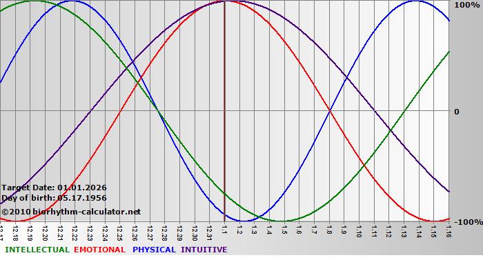 Your biorhythm above the horizontal line indicates that your capacity in that area is enhanced; you feel stronger, more alert, more connected, more empathetic. These are times when you are able to do more, be more, enjoy more. When the biorhythm lines are below 0%, your capacity is diminished, and conservative behavior is recommended.