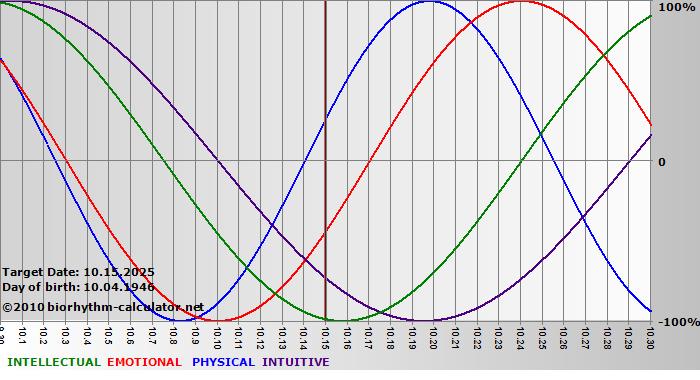 Your biorhythm above the horizontal line indicates that your capacity in that area is enhanced; you feel stronger, more alert, more connected, more empathetic. These are times when you are able to do more, be more, enjoy more. When the biorhythm lines are below 0%, your capacity is diminished, and conservative behavior is recommended.