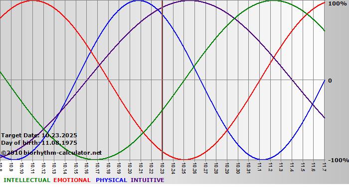 Your biorhythm above the horizontal line indicates that your capacity in that area is enhanced; you feel stronger, more alert, more connected, more empathetic. These are times when you are able to do more, be more, enjoy more. When the biorhythm lines are below 0%, your capacity is diminished, and conservative behavior is recommended.