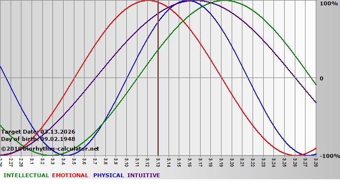Your biorhythm above the horizontal line indicates that your capacity in that area is enhanced; you feel stronger, more alert, more connected, more empathetic. These are times when you are able to do more, be more, enjoy more. When the biorhythm lines are below 0%, your capacity is diminished, and conservative behavior is recommended.