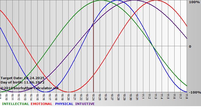 Your biorhythm above the horizontal line indicates that your capacity in that area is enhanced; you feel stronger, more alert, more connected, more empathetic. These are times when you are able to do more, be more, enjoy more. When the biorhythm lines are below 0%, your capacity is diminished, and conservative behavior is recommended.