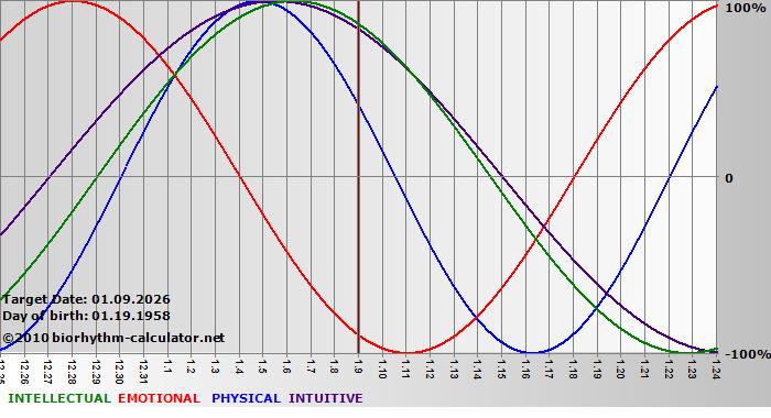 Your biorhythm above the horizontal line indicates that your capacity in that area is enhanced; you feel stronger, more alert, more connected, more empathetic. These are times when you are able to do more, be more, enjoy more. When the biorhythm lines are below 0%, your capacity is diminished, and conservative behavior is recommended.