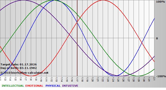 Your biorhythm above the horizontal line indicates that your capacity in that area is enhanced; you feel stronger, more alert, more connected, more empathetic. These are times when you are able to do more, be more, enjoy more. When the biorhythm lines are below 0%, your capacity is diminished, and conservative behavior is recommended.