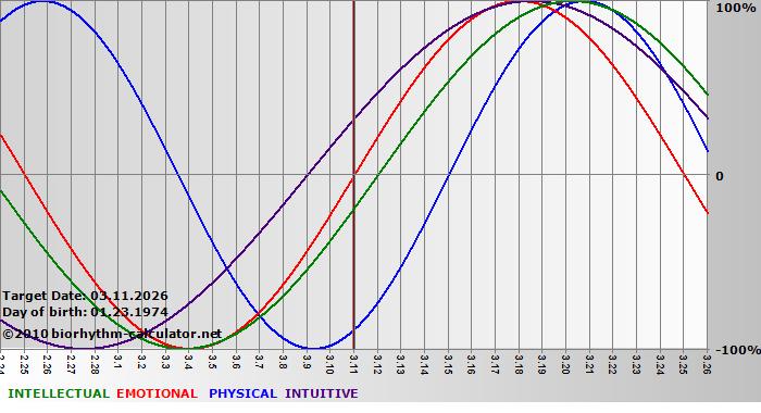 Your biorhythm above the horizontal line indicates that your capacity in that area is enhanced; you feel stronger, more alert, more connected, more empathetic. These are times when you are able to do more, be more, enjoy more. When the biorhythm lines are below 0%, your capacity is diminished, and conservative behavior is recommended.