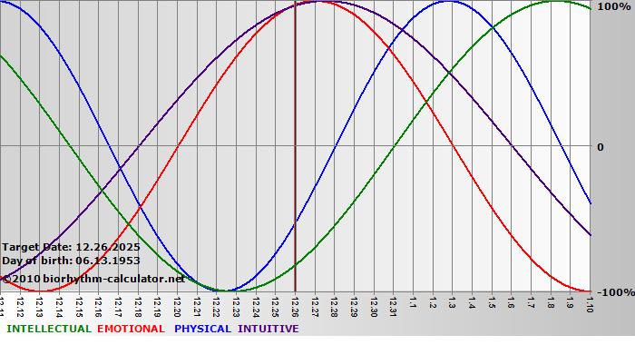Your biorhythm above the horizontal line indicates that your capacity in that area is enhanced; you feel stronger, more alert, more connected, more empathetic. These are times when you are able to do more, be more, enjoy more. When the biorhythm lines are below 0%, your capacity is diminished, and conservative behavior is recommended.