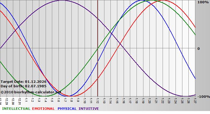 Your biorhythm above the horizontal line indicates that your capacity in that area is enhanced; you feel stronger, more alert, more connected, more empathetic. These are times when you are able to do more, be more, enjoy more. When the biorhythm lines are below 0%, your capacity is diminished, and conservative behavior is recommended.