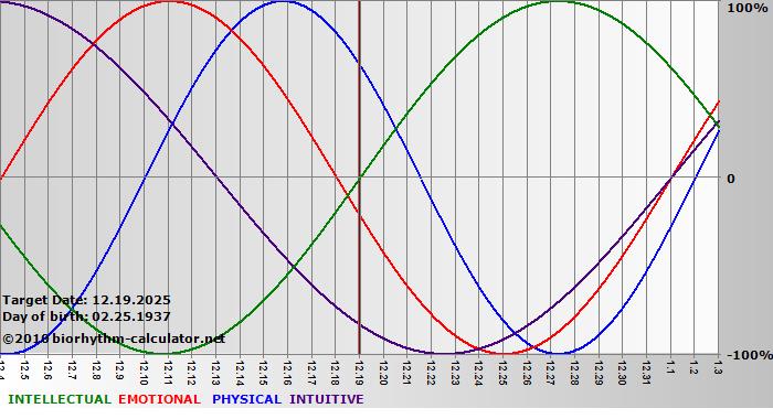 Your biorhythm above the horizontal line indicates that your capacity in that area is enhanced; you feel stronger, more alert, more connected, more empathetic. These are times when you are able to do more, be more, enjoy more. When the biorhythm lines are below 0%, your capacity is diminished, and conservative behavior is recommended.