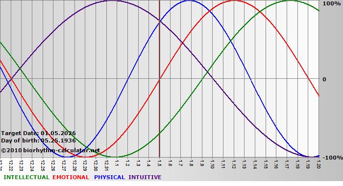 Your biorhythm above the horizontal line indicates that your capacity in that area is enhanced; you feel stronger, more alert, more connected, more empathetic. These are times when you are able to do more, be more, enjoy more. When the biorhythm lines are below 0%, your capacity is diminished, and conservative behavior is recommended.