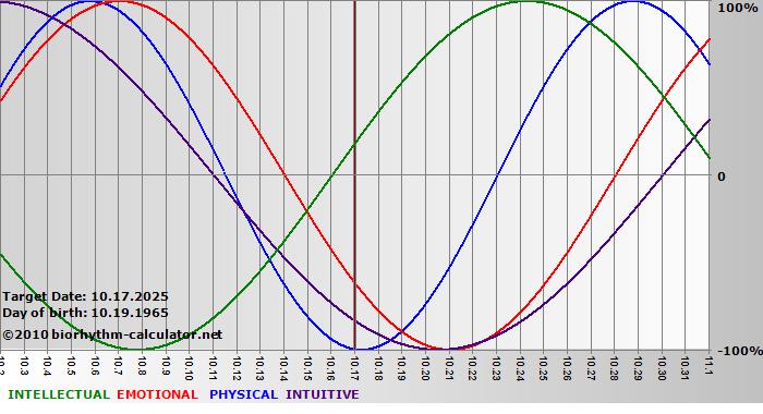 Your biorhythm above the horizontal line indicates that your capacity in that area is enhanced; you feel stronger, more alert, more connected, more empathetic. These are times when you are able to do more, be more, enjoy more. When the biorhythm lines are below 0%, your capacity is diminished, and conservative behavior is recommended.