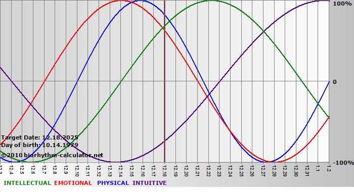 Your biorhythm above the horizontal line indicates that your capacity in that area is enhanced; you feel stronger, more alert, more connected, more empathetic. These are times when you are able to do more, be more, enjoy more. When the biorhythm lines are below 0%, your capacity is diminished, and conservative behavior is recommended.
