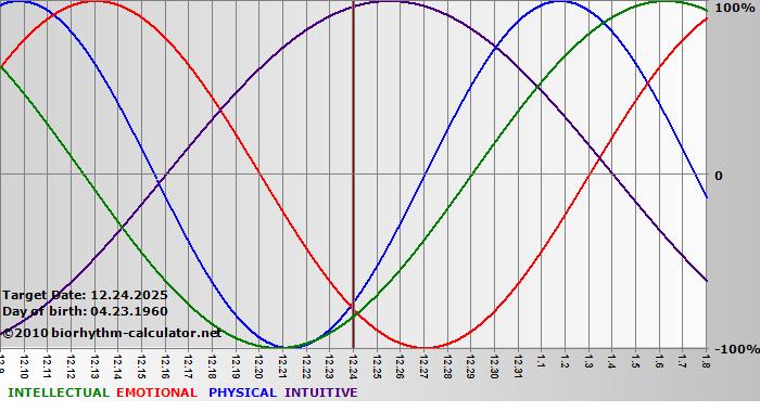 Your biorhythm above the horizontal line indicates that your capacity in that area is enhanced; you feel stronger, more alert, more connected, more empathetic. These are times when you are able to do more, be more, enjoy more. When the biorhythm lines are below 0%, your capacity is diminished, and conservative behavior is recommended.