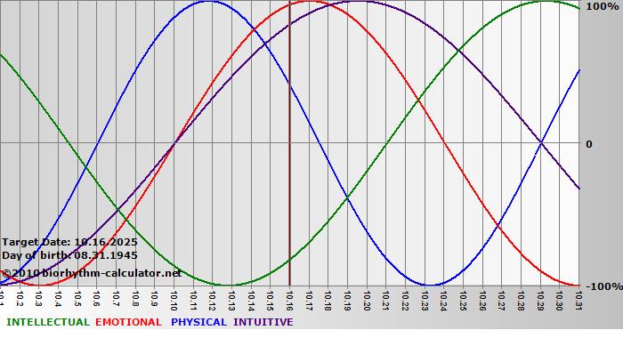 Your biorhythm above the horizontal line indicates that your capacity in that area is enhanced; you feel stronger, more alert, more connected, more empathetic. These are times when you are able to do more, be more, enjoy more. When the biorhythm lines are below 0%, your capacity is diminished, and conservative behavior is recommended.