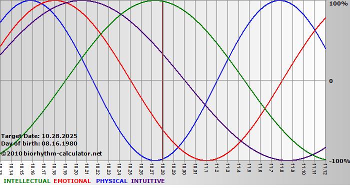 Your biorhythm above the horizontal line indicates that your capacity in that area is enhanced; you feel stronger, more alert, more connected, more empathetic. These are times when you are able to do more, be more, enjoy more. When the biorhythm lines are below 0%, your capacity is diminished, and conservative behavior is recommended.