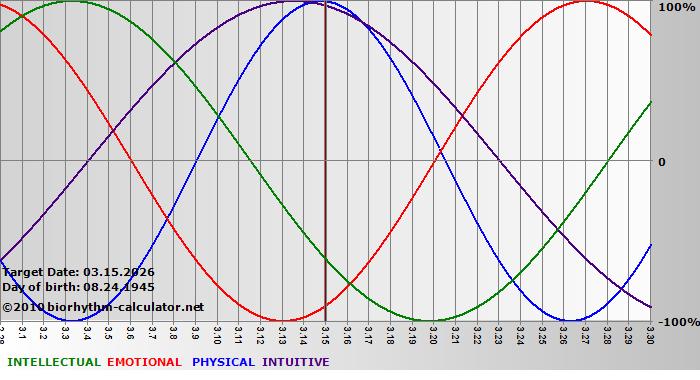 Your biorhythm above the horizontal line indicates that your capacity in that area is enhanced; you feel stronger, more alert, more connected, more empathetic. These are times when you are able to do more, be more, enjoy more. When the biorhythm lines are below 0%, your capacity is diminished, and conservative behavior is recommended.