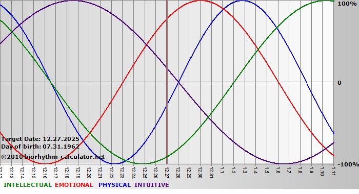 Your biorhythm above the horizontal line indicates that your capacity in that area is enhanced; you feel stronger, more alert, more connected, more empathetic. These are times when you are able to do more, be more, enjoy more. When the biorhythm lines are below 0%, your capacity is diminished, and conservative behavior is recommended.