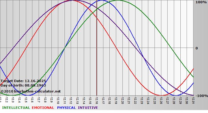 Your biorhythm above the horizontal line indicates that your capacity in that area is enhanced; you feel stronger, more alert, more connected, more empathetic. These are times when you are able to do more, be more, enjoy more. When the biorhythm lines are below 0%, your capacity is diminished, and conservative behavior is recommended.