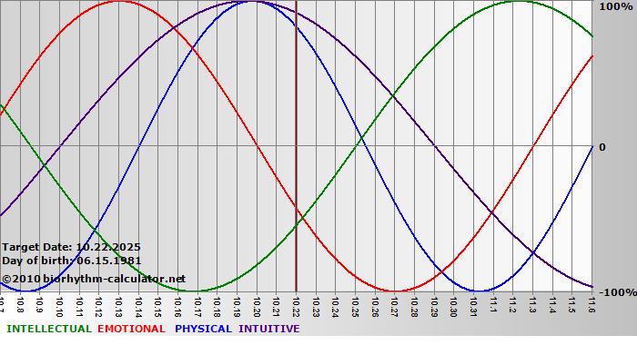 Your biorhythm above the horizontal line indicates that your capacity in that area is enhanced; you feel stronger, more alert, more connected, more empathetic. These are times when you are able to do more, be more, enjoy more. When the biorhythm lines are below 0%, your capacity is diminished, and conservative behavior is recommended.