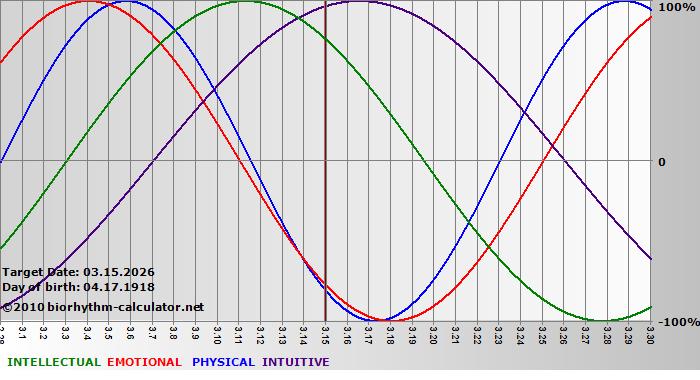 Your biorhythm above the horizontal line indicates that your capacity in that area is enhanced; you feel stronger, more alert, more connected, more empathetic. These are times when you are able to do more, be more, enjoy more. When the biorhythm lines are below 0%, your capacity is diminished, and conservative behavior is recommended.