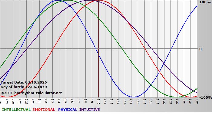 Your biorhythm above the horizontal line indicates that your capacity in that area is enhanced; you feel stronger, more alert, more connected, more empathetic. These are times when you are able to do more, be more, enjoy more. When the biorhythm lines are below 0%, your capacity is diminished, and conservative behavior is recommended.