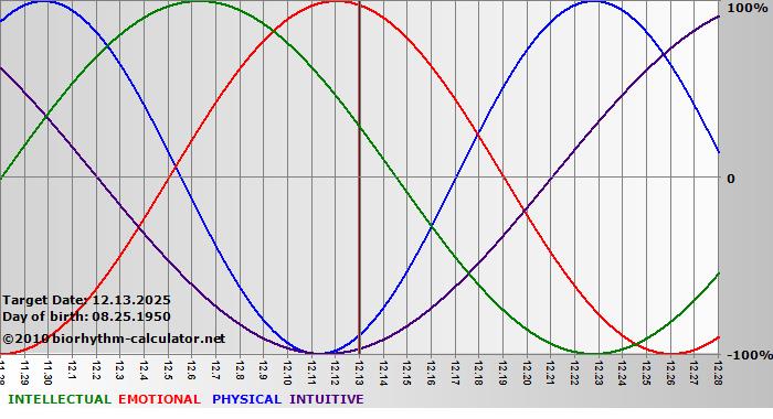 Your biorhythm above the horizontal line indicates that your capacity in that area is enhanced; you feel stronger, more alert, more connected, more empathetic. These are times when you are able to do more, be more, enjoy more. When the biorhythm lines are below 0%, your capacity is diminished, and conservative behavior is recommended.